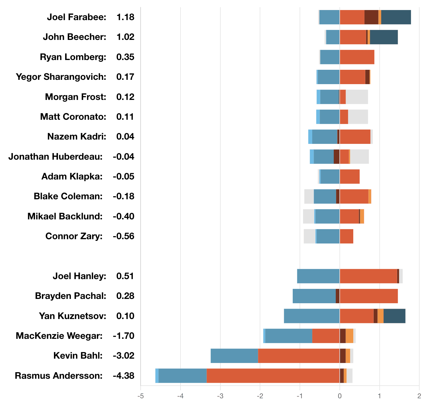 Taken By Chance – Flowers to Yegor Sharangovich (81.51 SCF% // 86.74 HDCF%) for his 14-2 high danger chance difference. Calgary poured it on both early and late in the third period, Sharangovich was right in the middle of it all. After a dominant stretch where he wound up as first star of the week for the entire NHL, Rasmus Andersson (20.91 per cent // 23.76 per cent) had a bit of a stinker. Based on the current body of work it does not concern me, it just sucks the hot streak came crashing to a halt.