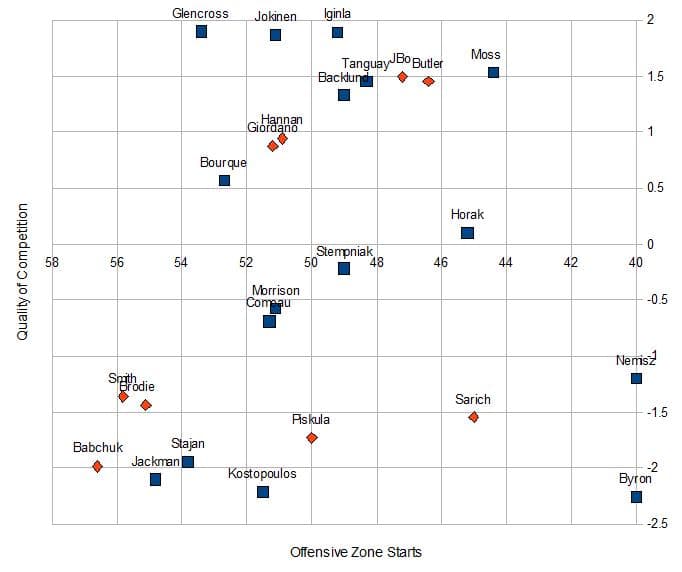 Player TOI/GP CE/60 Jay Bouwmeester 3.6 94.8 Scott Hannan 2.7 83.2 Chris Butler 2.5 94.1 Curtis Glencross 2.3 92.3 Mark Giordano 2.2 92.6 Lee Stempniak 1.8 84.3 Rene Bourque 1.7 85.8 David Moss 1.5 143.1 Tom Kostopoulos 1.5 86.0 Alex Tanguay 0.8 69.4 Mikael Backlund 0.8 85.0 Blake Comeau 0.8 79.5 Matt Stajan 0.7 140.6 Olli Jokinen 0.6 76.3 Cory Sarich 0.6 166.6 Brendan Morrison 0.5 84.6 Roman Horak 0.4 111.9 Derek Smith 0.4 35.8