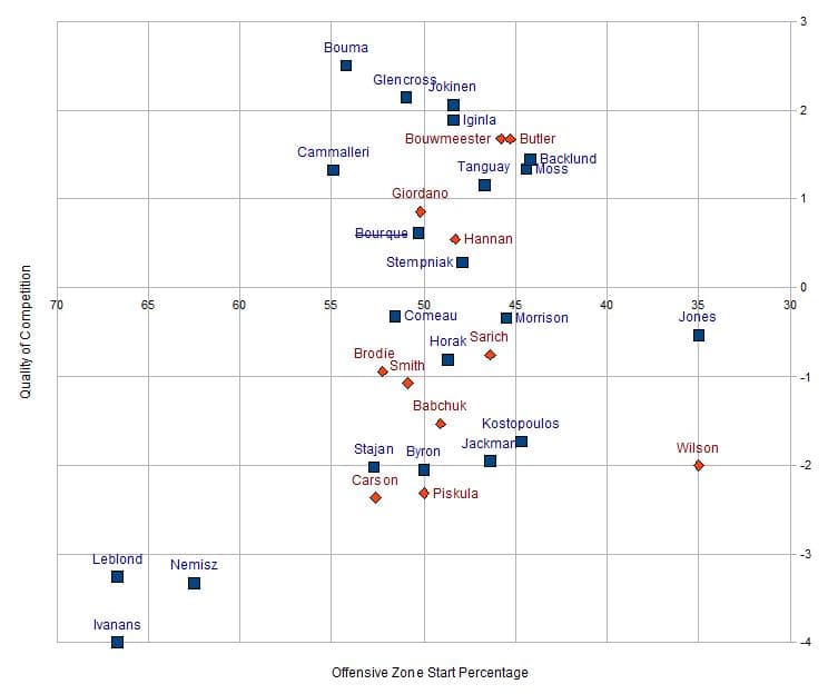 Mike Cammalleri’s role has been similar to Alex Tanguay’s, but with more of a lean towards the offensive zone – certainly more of a top-six job than Rene Bourque’s occasional flirtations.