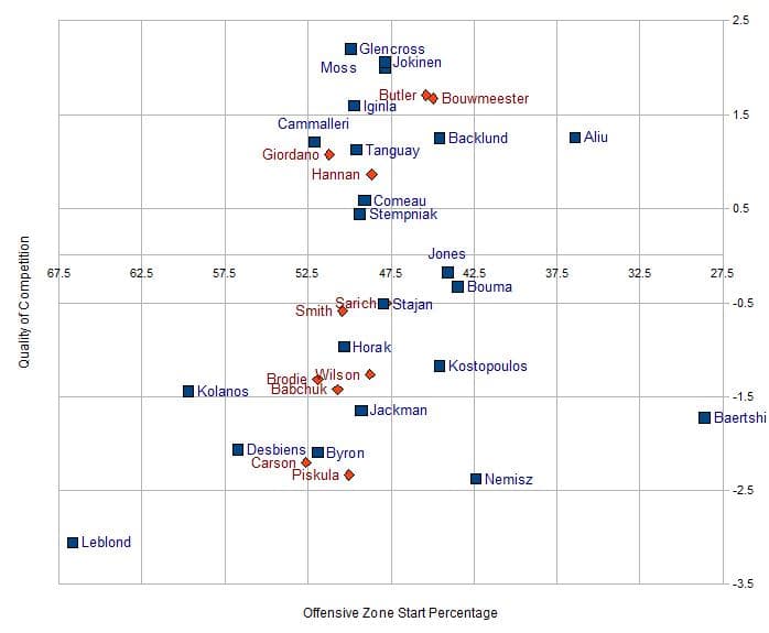 Calgary used 26 forwards this season, one short of the club record. As expected, Jokinen, Tanguay, Iginla, Glencross and Moss all got the tougher assignments just like last year, with the main surprise being that Mikael Backlund’s role changed from more of a sheltered third-liner to those top-six type minutes.