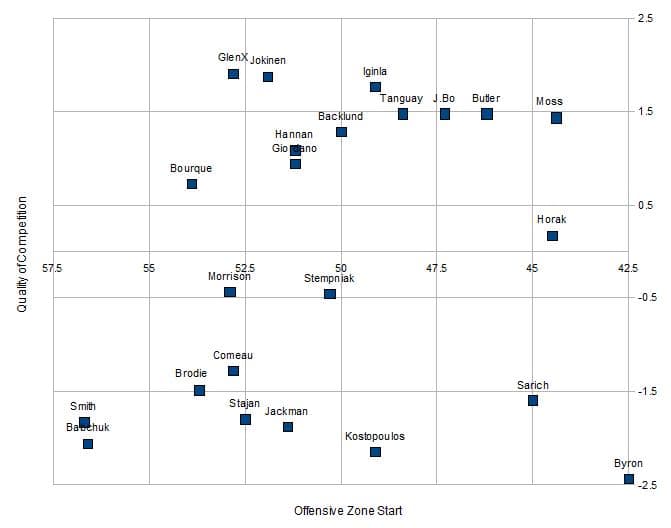 Player TOI/GP CE/60 Jay Bouwmeester 3.5 96.1 Scott Hannan 2.7 86.4 Chris Butler 2.5 93.3 Curtis Glencross 2.3 93.5 Mark Giordano 2.2 92.6 Lee Stempniak 1.8 84.0 Rene Bourque 1.7 84.7 David Moss 1.5 143.1 Tom Kostopoulos 1.5 92.5 Mikael Backlund 0.9 87.5 Alex Tanguay 0.8 67.2 Matt Stajan 0.7 138.5 Blake Comeau 0.7 84.0 Brendan Morrison 0.6 84.6 Cory Sarich 0.6 166.6 Olli Jokinen 0.5 81.0 Roman Horak 0.4 111.9