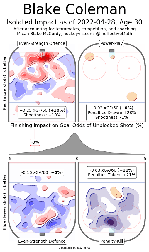 His impact on the penalty kill as well has been terrific. Look at the heatmap above – it is remarkable to have a defensive impact that dark of shade in front of the net when down a man. It’s not just him – the whole unit deserves credit – but Coleman and his contributions do not go unnoticed.