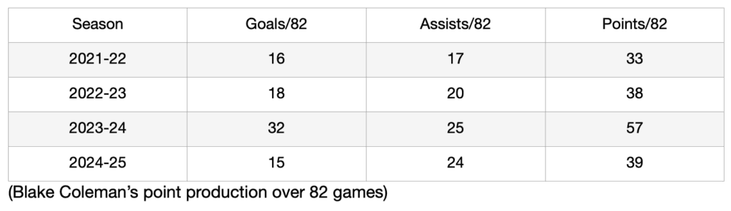 From a production standpoint, it is fair to expect Coleman to put up 15-20 goals and 33-39 points, every similar to his output in three of his four seasons in Calgary. The 2023-24 season was a career year and an outlier. I don’t think we will see that type of production from Coleman again.