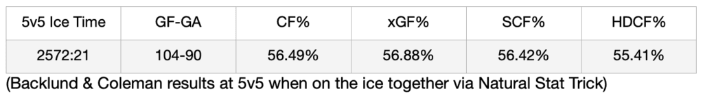 Secondly, his defensive results would have to take a hit. Coleman has been one of the best analytical players on the Flames over the last three seasons. He would be playing below expectations if those key stats like CF%, SCF%, HDCF%, and xGF% all fall below 50%.