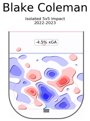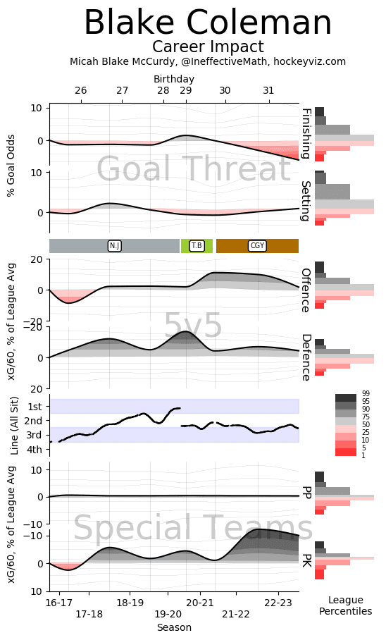 As we look at his career impact trajectory we do see his finishing ability has nosedived in Calgary. The team as a whole had abysmal puck luck (just ask Tyler Toffoli about it), but even then Coleman’s collective on ice shooting percentage was below 7% – way lower than even an average amount.