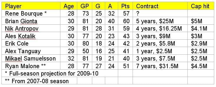 When looking at the 2009 crop of free-agent forwards, it’s a real struggle to find a comparable for Bourque in terms of age, style and productivity. Below, you’ll see a chart that compares Bourque’s projected 2009-10 numbers to the statistics posted by 2009 free agents who were very vaguely in Bourque’s ballpark in terms of age and contract-year production. The best comparable might go back to the summer of 2008, when Pittsburgh’s Ryan Malone hit the open market.