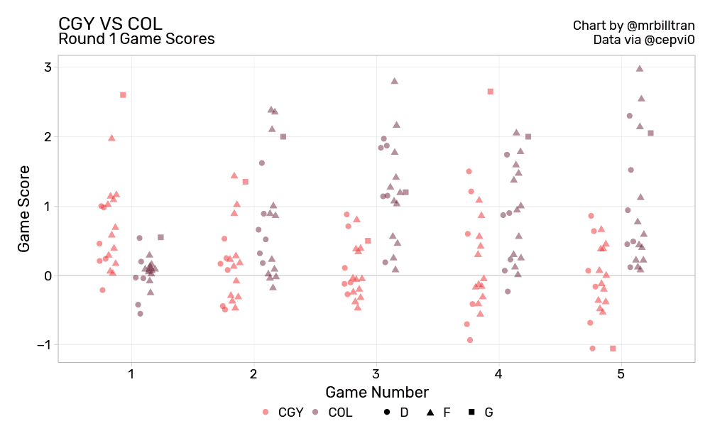 Conversely, the Flames’ forwards struggled after Game 1. No single player had a particularly good performance, and a group of Flames ended up with game scores below zero in every game they lost. Their best players just weren’t able to muster any offence to put the Avalanche on high alert.