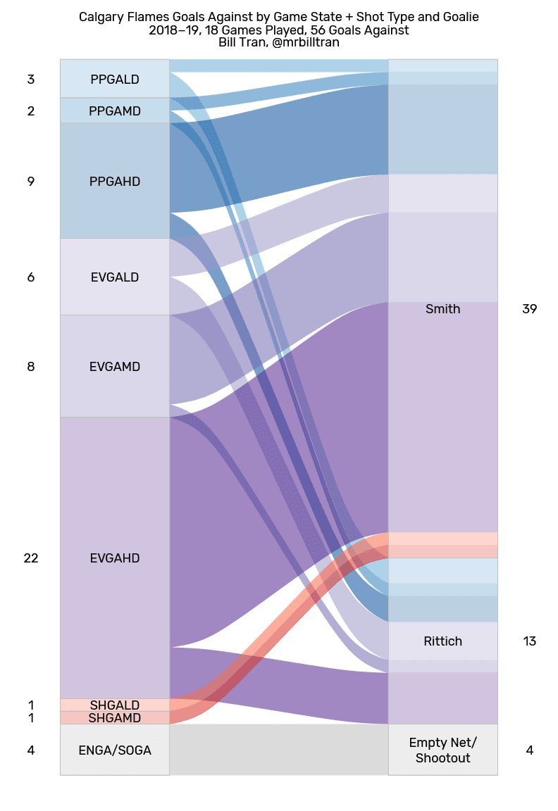 I made a data visualisation to break down how goals have been scored on the Flames. Goals are sorted by situation, as well as shot quality. This gives a good understanding of what types of scenarios Smith and Rittich have been scored on, as well as what types of shots have beaten them.