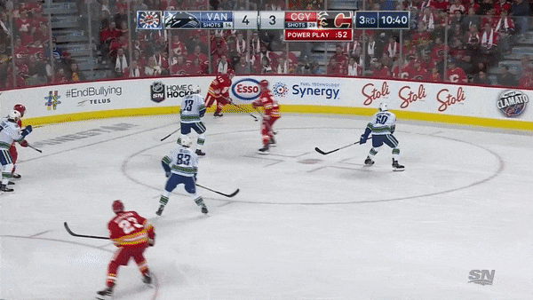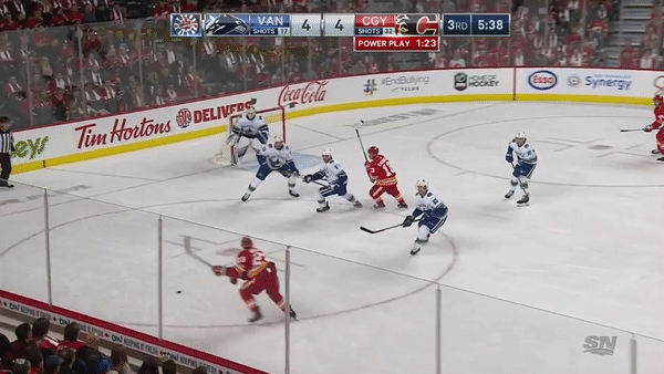 But then. Then. Still on the same powerplay, with eight seconds to go. A Tkachuk pass, a Sean Monahan all alone in the slot, and a Johnny Gaudreau there to collect the rebound and finish it off.