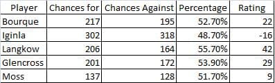 So, Bourque ranks behind Glencross and Langkow when it comes to scoring chances generated while on the ice at even strength, specifically 5-on-5. Bourque was clearly an impact player last year, even without looking at his point totals.