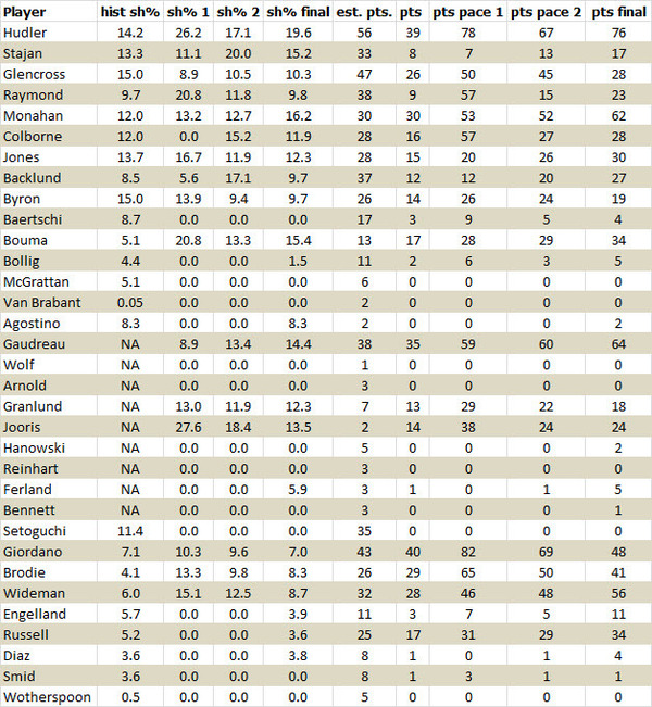 Hudler, Monahan and Gaudreau are the standouts, far exceeding the points estimate.