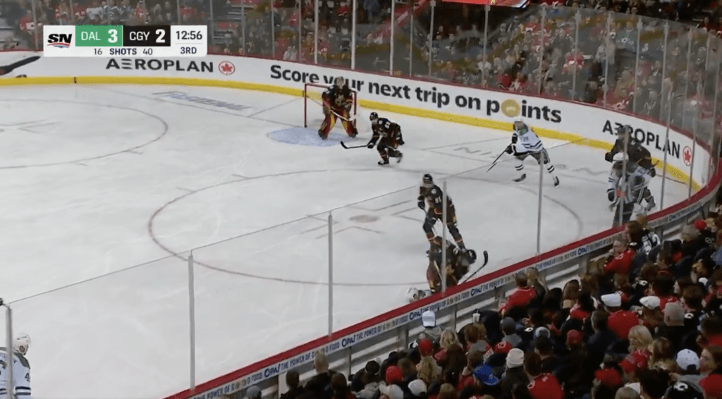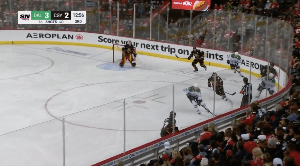 The sequence unfolded in the Flames zone 7:10 into the third period. On the play, the Flames were attempting to move the puck up the side boards in an effort to break the puck out of the zone. Stars forward Mikko Rantanen was attempting to intercept the puck as it was moving along the boards and he lost his footing.