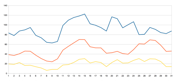 Here’s a chart. Each line represents the team’s score-adjusted even strength Corsi, Scoring Chances or High-Danger Scoring Chances for and against on a five-game rolling average.