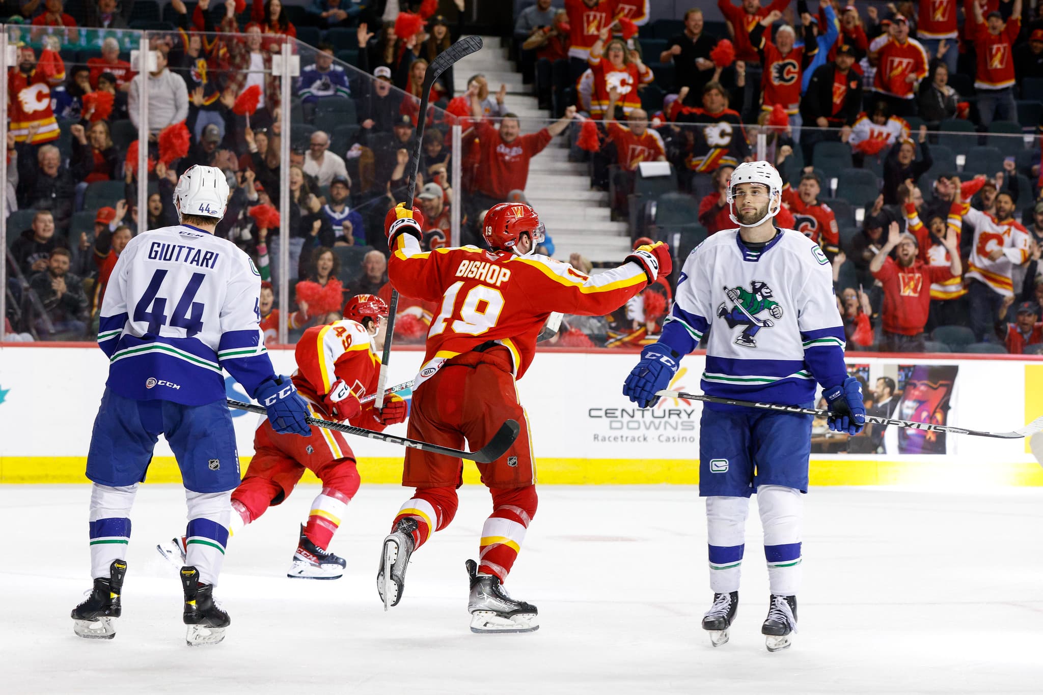 Bishop played in all nine playoff games for the Wranglers, earning three points over the course of the two series. He scored two goals and assisted on Jakob Pelletier’s overtime winner in their first playoff game against Abbotsford. His goals came in the second game of the Canucks’ series and in the last game of the Firebirds series.
