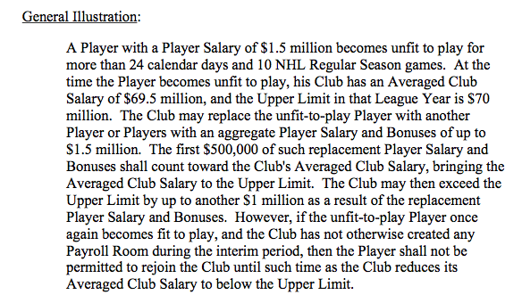 (This passage from section 50.10 refers to an “interim” period between when a player initially goes on LTIR and when they’re fit to play, which indicates that teams are able to shuffle things underneath that cap relief. It’s the most specific example in the section about whether adjustments can be made.)