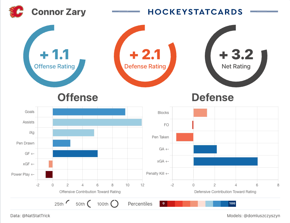 He has been a stalwart on Nazem Kadri’s flank for the lion’s share of the 2023-24 campaign and has certainly boosted Kadri’s on-ice play (and vice versa). The line of Kadri, Zary, and Martin Pospisil has been the Flames’ most dangerous goal-scoring trio throughout most of the season.