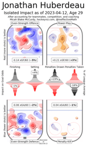 First, let’s go over what he did in 2022-23. In 79 games, Huberdeau tallied 15 goals and 40 assists for 55 points while averaging 16:52 of time on ice, which was the second-lowest of his career by 5 seconds. He also shot 11.9 percent on 233 shots, which was the third-lowest percentage of his career. He didn’t generate much from the slot and the middle of the ice like he did last season with Florida, and that was evident in the numbers as well.