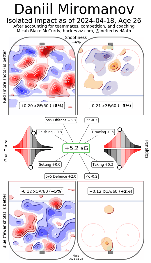 The ability to have a defenceman contribute that heavily to chances in the crease is not something you would see in every defenceman. Most defenceman have their shot map be near the blueline with next to nothing near the net, but Miromanov isn’t your usual defenceman. Watch him score this goal off a rebound – he was exactly where a winger would be sitting with anticipation for the rebound and he got their while coming in down from the right side of the ice.