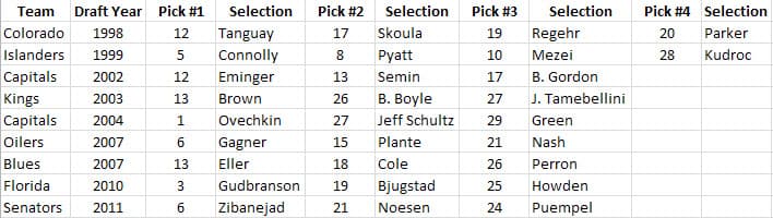 By chronological order, those teams are the Avalanche in 1998 with 4 picks, the Islanders in 1999 with another 4, then the Capitals in 2002 with three, L.A. in 2003 with three, the Caps again in 2004 with three, the Oilers and Blues both in 2007 with three each, then the Panthers in 2010 with three and finally the Senators in 2011 with three.