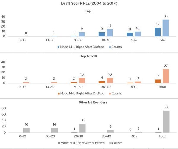 Above is a look at the draft-year NHLE of first round draftees from 2004 to 2014. As well, I’ve included the number of players in each group to jump right into the NHL after being drafted.