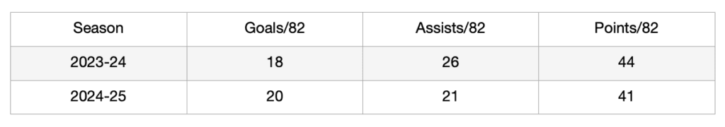Zary was not able to keep the momentum going into his sophomore season. He looked dynamic at times during the first half of the season, but the point production wasn’t where he wanted it to be. He put up 27 points in 54 games (41 point pace over 82 games), a slight decline in production compared to his rookie season.