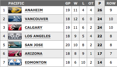 The Flames (11-6-2) host the Anaheim Ducks (11-4-4). Both teams are playing their 20th game. Anaheim has 26 points to Calgary’s 24. If Calgary wins in regulation, they will be tied with Anaheim with 26 points and have more wins (12), which is the tie-breaker.