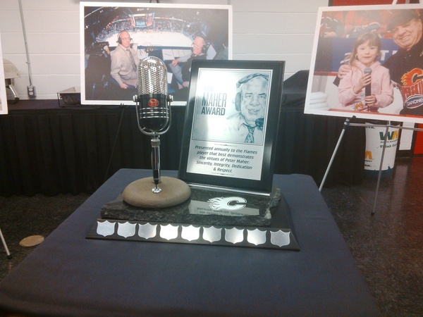 I was down at the ‘Dome this morning for and they officially renamed the Good Guy Award – given to the player who’s the most patient and out-going with the media – to the Peter Maher Award. And now they have a really sweet-looking actual award to present. (Joe Colborne won the award last season.)