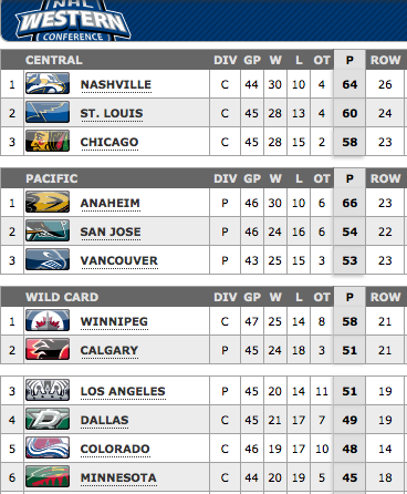 At 24-18-3, the Calgary Flames have 51 points and enter tonight tied for the last wild-card spot in the Western Conference. The team they’re tied with is the Los Angeles Kings, who have a 20-14-11 record with 51 points. The Flames win the tie-breaker by virtue of having more regulation and overtime wins (21 for Calgary, 19 for the Kings).