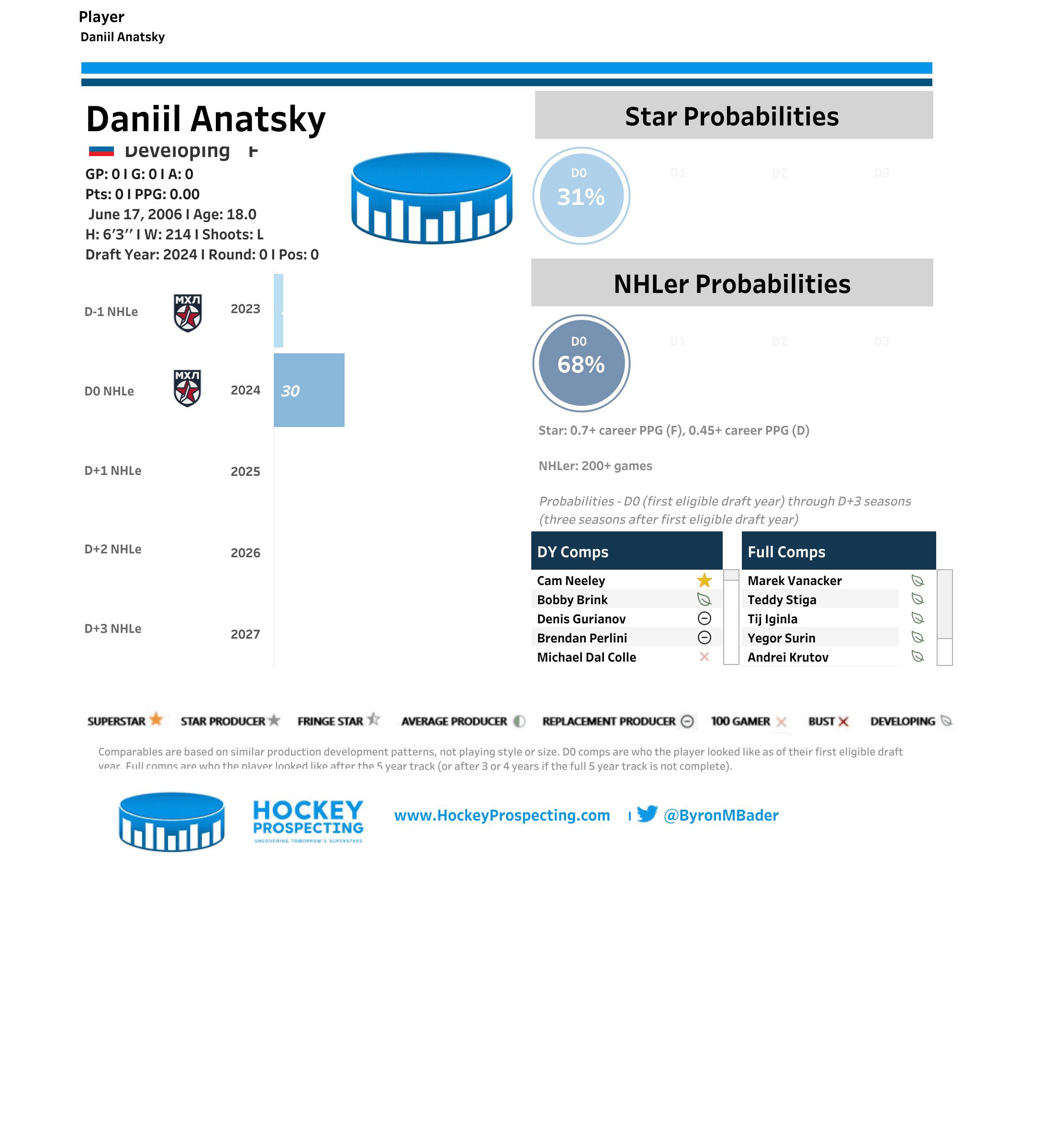 Anatsky is not projected to go very high – if at all. He’s got a Star probability similar to that of Misa, but the model really loves the odds of him being able to become an NHLer. With the size to be a difference making winger in the NHL and the production numbers to back it up Anatsky could be worth a flyer.