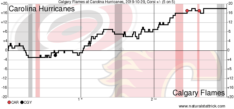 This graph should tell you everything you need to know. The Flames let this one get away from them when there was never any reason to. Carolina started the second hot, and the Flames had a brief stretch where they were wrestling back control, but it was all Hurricanes after that. It appeared only one team knew the score during the game.