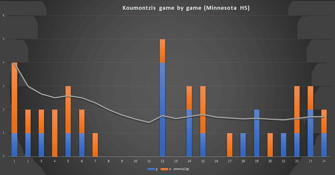 We’ll start with Koumontzis’ performances in Minnesota high school hockey. As a member of the powerhouse Edina High School hockey team (they scored 50 goals through their first six games and beat a team 20-0 once last year), Koumontzis was a regular contributor. He started the season off really hot, but cooled down before an explosive four-goal performance. From there, he gained a little bit more consistency, finishing the year with 20 points in his last 10 games.