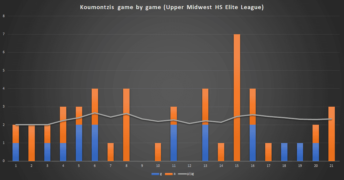 It’s interesting to note how Koumontzis’ role changed between the two competitions. With Edina, he was more of an all around goal scoring threat, potting 20 goals. However, he switched to more of a playmaking role in the Elite League, picking up more assists (33 vs 21) than goals (13 vs. 20). Notable is his seven-assist game, but he did pick up two or more assists in seven different games.