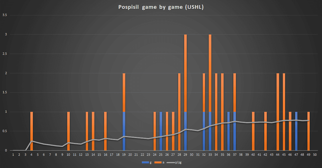 Given that most of his competition ahead of him is from the U.S. National Development Team, Pospisil has some great numbers for the average USHL player.