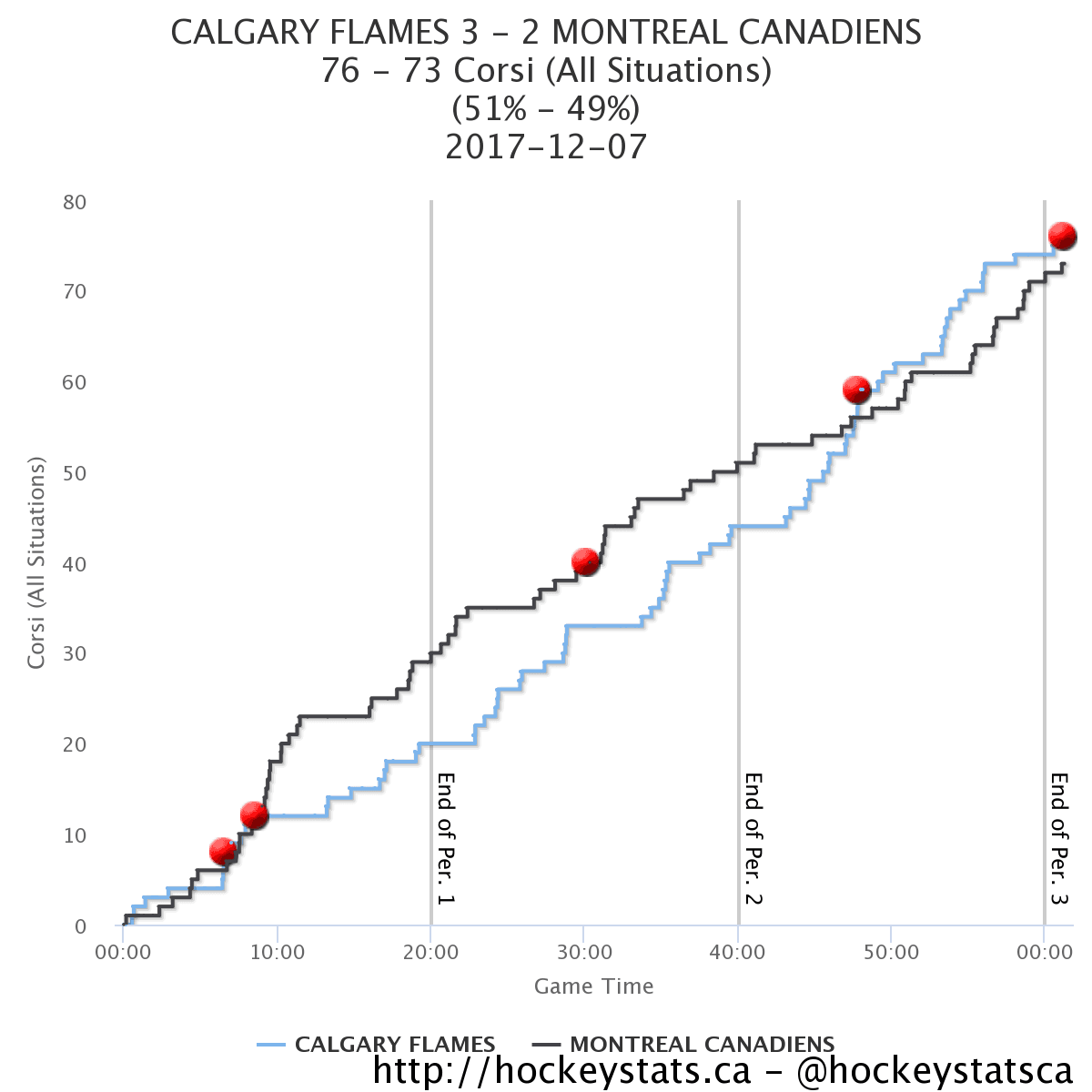 It looked like the Flames had the game handed to them when Phillip Danault cleared the puck over the glass. A minute-long five-on-three, when they had already been pressing to take the lead, with less than 10 minutes to go? That’s a win, right there. The Flames have a powerplay clicking along one-in-five times aaaaand they kind of just wandered around with the puck and aside from a Monahan ping off the post didn’t do anything of note.