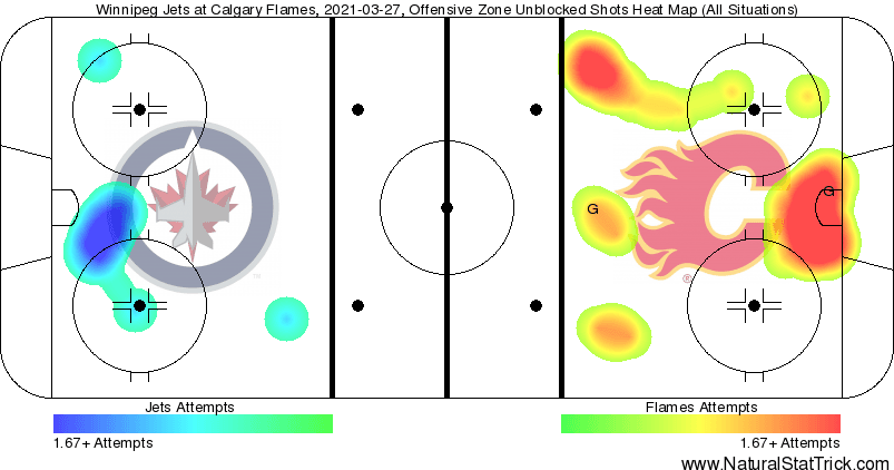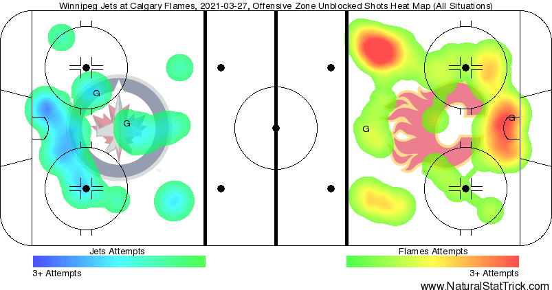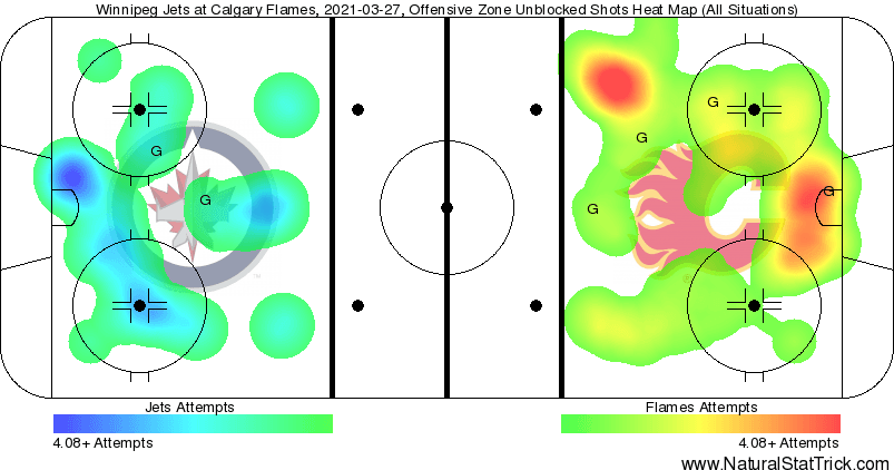 The Calgary Flames have routinely struggled to generate chances from the slot in their more tightly contested games this season, and last night’s victory against the Winnipeg Jets was honestly no exception.