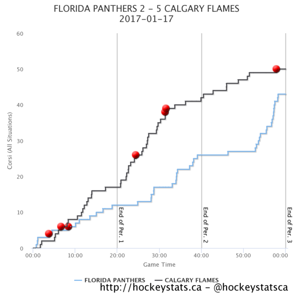 The Flames outshooting the Panthers 29-22 is actually really flattering to Florida; via HockeyStats.ca, the Panthers didn’t seem to realize just how many goals they’d fallen behind until there were only seven minutes left in the game.