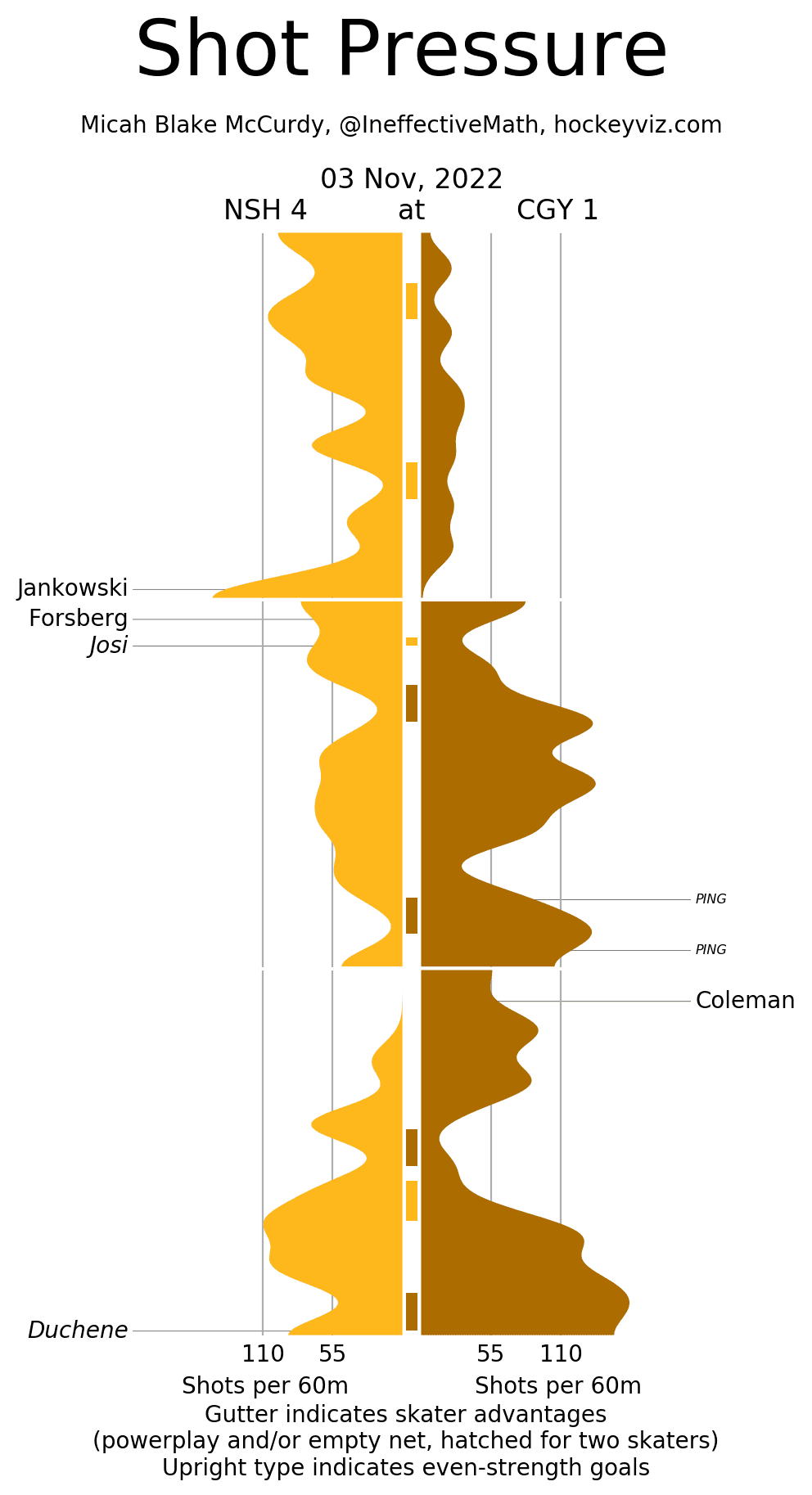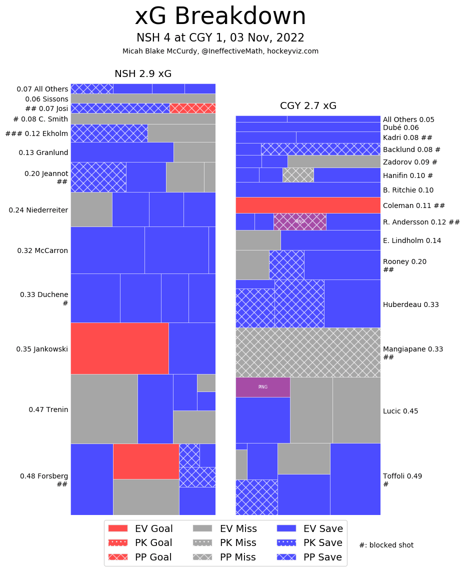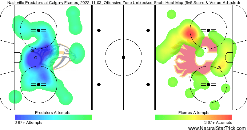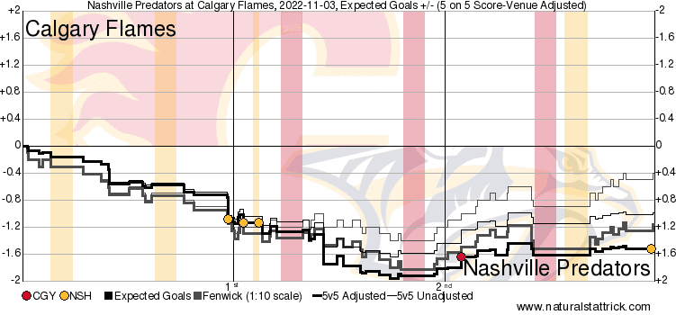 One thing that stands out on the Calgary side – a whole lot of missed attempts. The best looks the Flames generated failed to hit the net. When you’re on the wrong side of possession you have to make your attempts count – Calgary couldn’t come through there against Nashville.