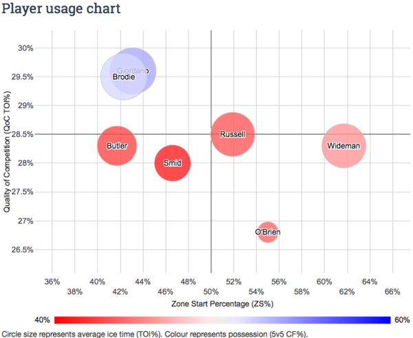 – Way over on the right side of the screen is Dennis Wideman. As you can see, he had the easiest minutes of any regular defender on the team and still couldn’t stay out of his own end. These are bad results in isolation, but horrible when considered in light of his $5.25M/year contract. He has 3 years left on the deal and if the Flames weren’t struggling to meet the cap floor he’d be a buy-out candidate.