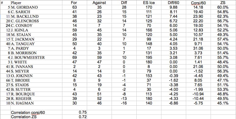 The columns are, in order: chances for, against, chance differential, ES ice time, chance differential per 60 minutes of ice, corsi rate/60 minutes of ice and zone start ratio (offensive-zone to defensive zone). The players are ordered from best differential/60 rate (Mark Giordano) to the worst (Nicklas Hagman).