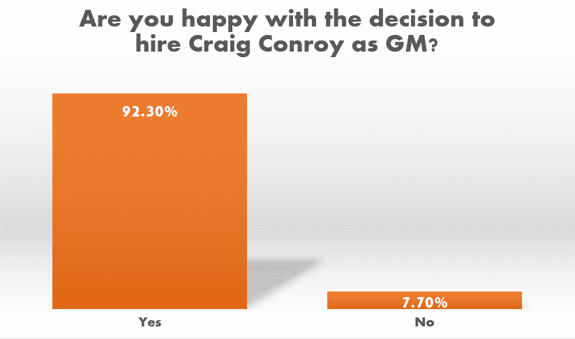 92.3% of Flames fans are excited to have Conroy leading the Flames hockey operations department. His excellent performance at his introductory press conference went a long way in solidifying himself as the right person for the job. This hire is quite the PR win for the Flames organization.