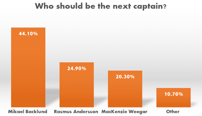No surprise to see Mikael Backlund get a significant portion of the vote to become the next captain. We have heard Flames players in the media say that Backlund is their leader. he has been with the team the longest and has worn an A for a long time. Now is the time to give him the captaincy according to 44.1% of the voters.