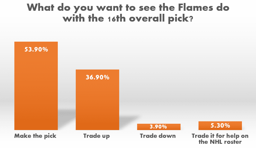The Flames don’t have the deepest prospect system. One of Conroy’s biggest jobs is to replenish that group of players and the best way to do that is to pick in the first round. 90% of the voters want to see the Flames either make the pick at 16, or try to trade up to draft a better player.