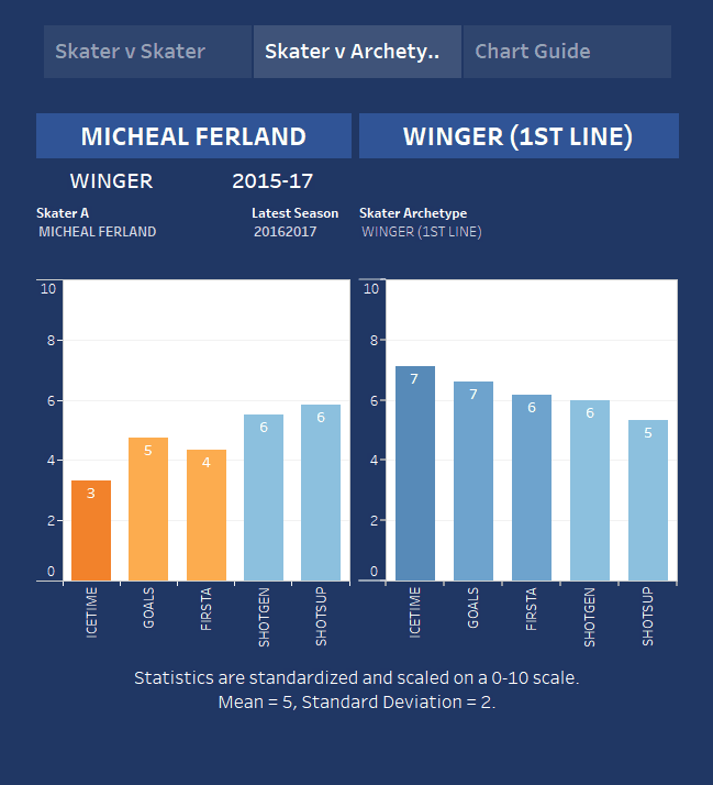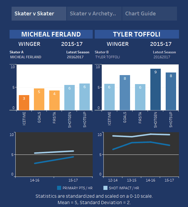 By the HERO chart’s standards, Ferland should certainly hang court with the first line. He’s had sneaky good possession metrics in less than ideal situations before Gulutzan tried him on the first line. Ideally, goals and first assists go up as Ferland gets more ice time and he shoots a bit more than he already does. There might be the chance that seeing more ice time and better players might bring those shot metrics down, but in the short time he was on that top line, it was a very strong line.