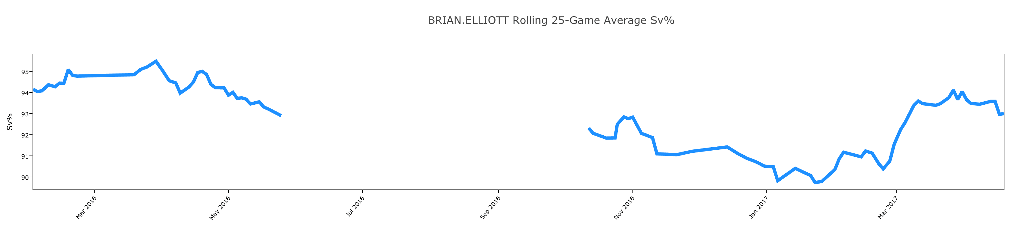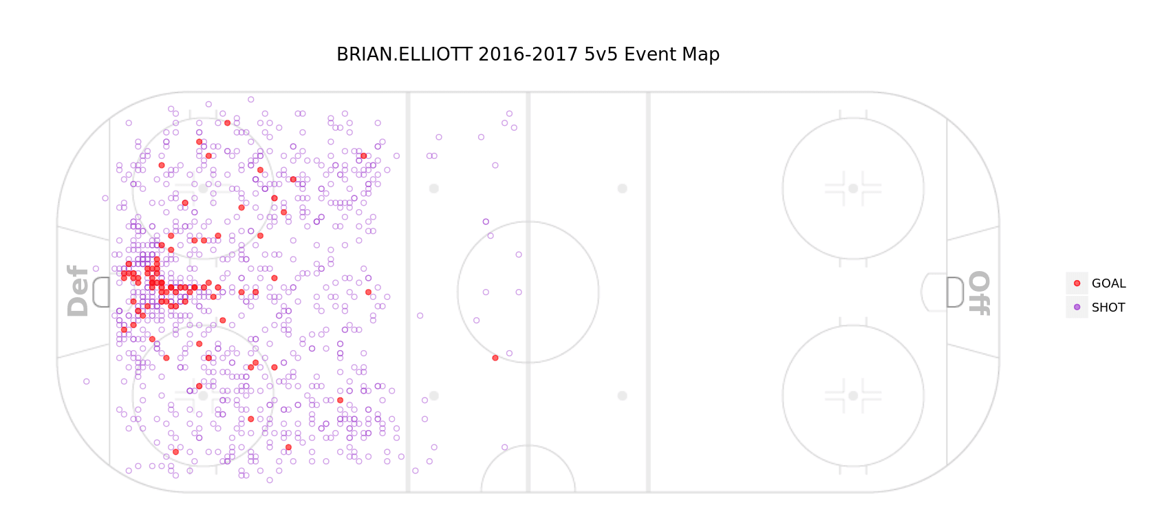 Among goalies with at least 1,500 5v5 minutes played, Elliott was 23rd out of 36 in 5v5 SV% with 92.12%. That’s almost a full percentage point above the worst goalie (Cam Ward, 91.28%), and almost two back of the best (Craig Anderson, 94.04%). It’s not that he had the worst save percentage ever, but he just barely avoided staying out of the bottom third of this group.