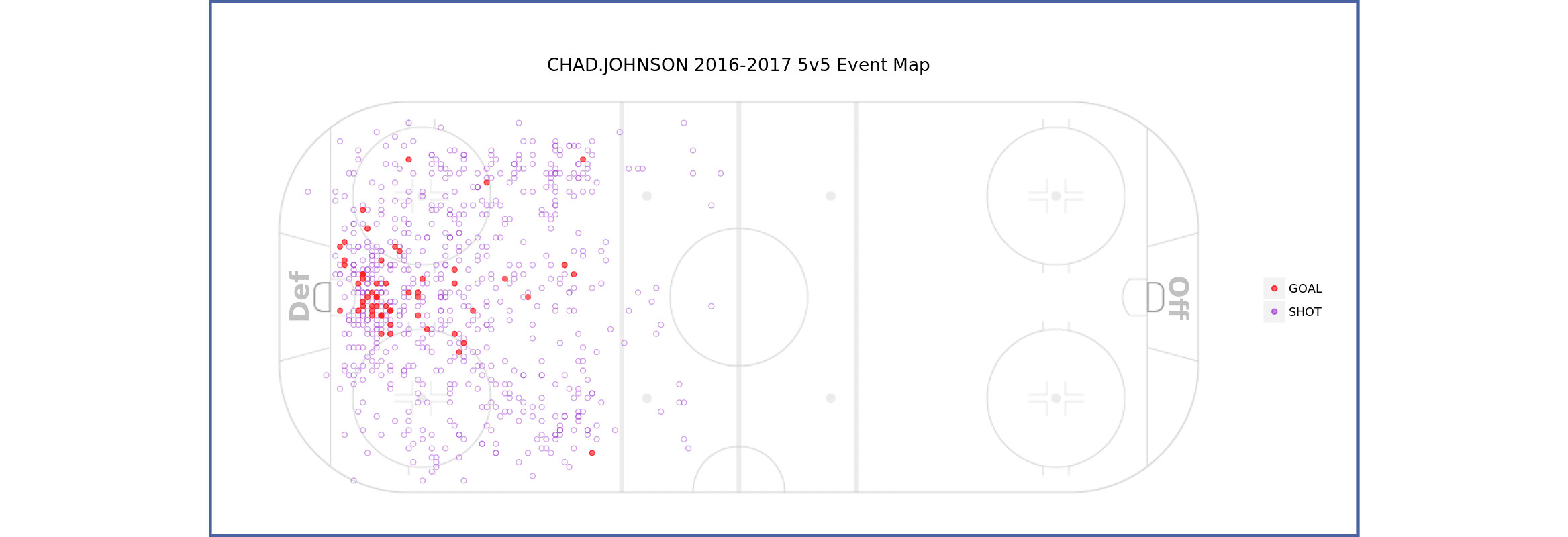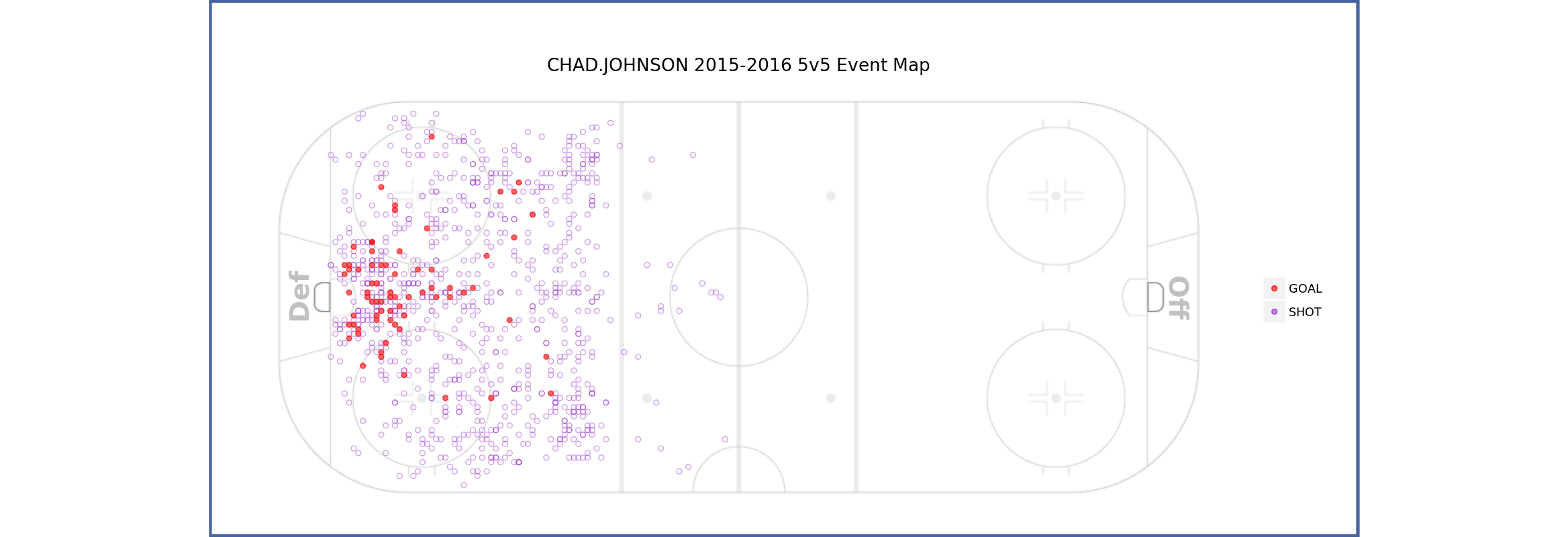Johnson gave up goals primarily from the home plate area, with a slight skew towards the right (blocker) side of the slot. He also allowed a few goals from weird areas, with the “how did he let that in?!” grouping of shots being primarily from the far left (glove) side of the ice.