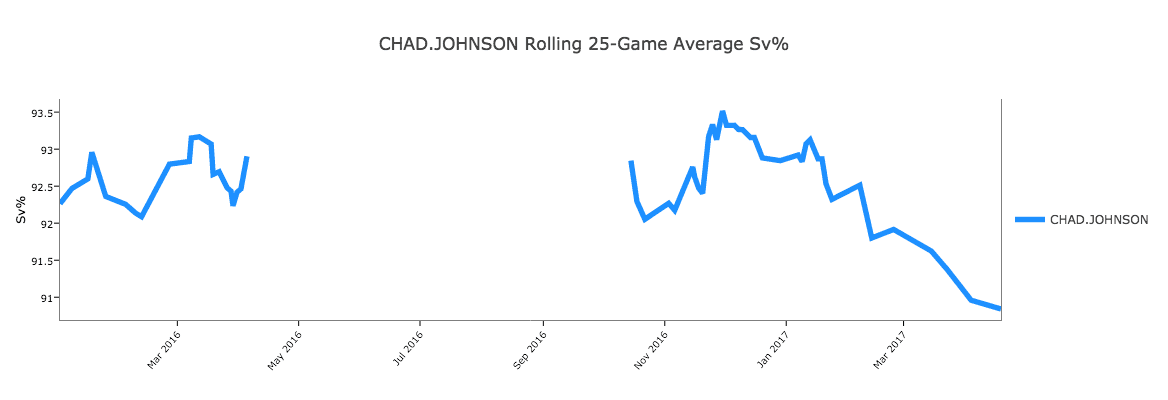 For the full season, Johnson had a .917 even strength save percentage. He ranked 39th of the 52 goalies who played 20 or more games in that category. (That makes his performance for the season as good as Ben Bishop or Marc-Andre Fleury, and for a lot less money.)