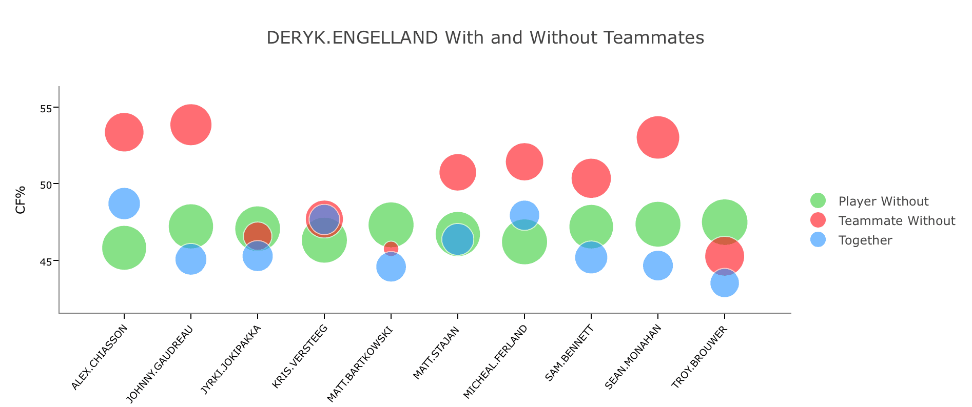 Because his defense partners bounced around so much, many of Engelland’s most frequent linemates were actually forwards. As you can see no player was better with Engelland than without him (aside from Versteeg, where there was no difference). The Flames’ top line players and Engelland were also a rather toxic mix, with everyone being much worse off when they played together than otherwise. Gaudreau and Monahan, for instance, saw a 10% swing in possession with and without Engelland.