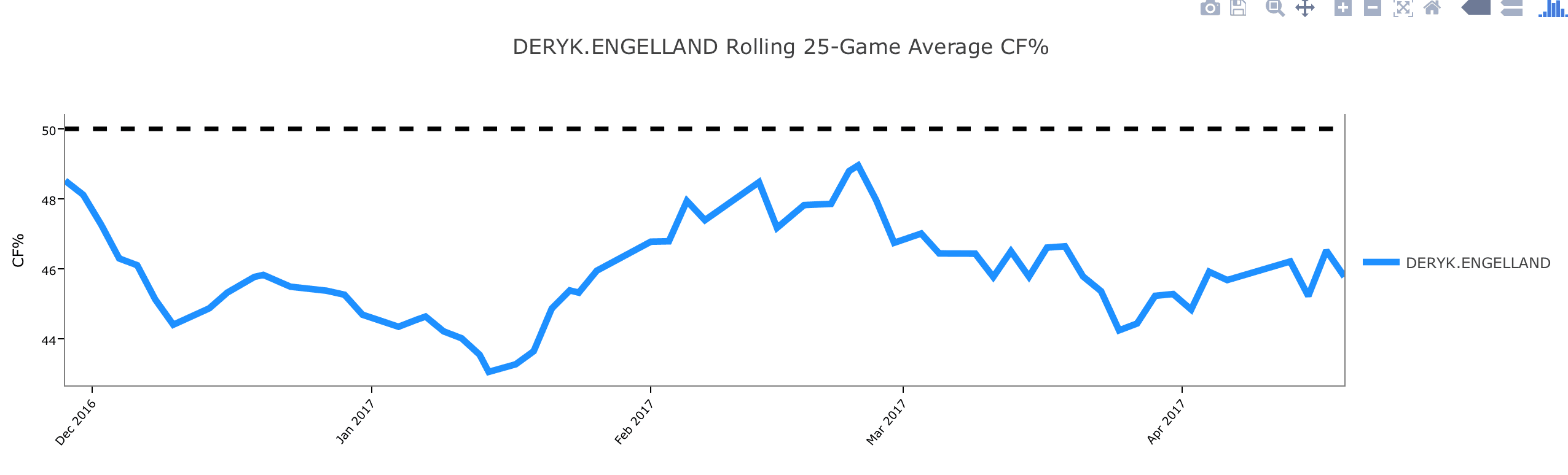 On the other hand, the math is not an Engelland fan. Though he tends to play against mostly third and fourth liners at even strength, Engelland consistently gets outshot and out-chanced on a nightly basis. At age 35, he’s also a good bet to see his performance step into an elevator shaft. That’s bad given he is, at best, a replacement-level NHLer by most measures at this point.