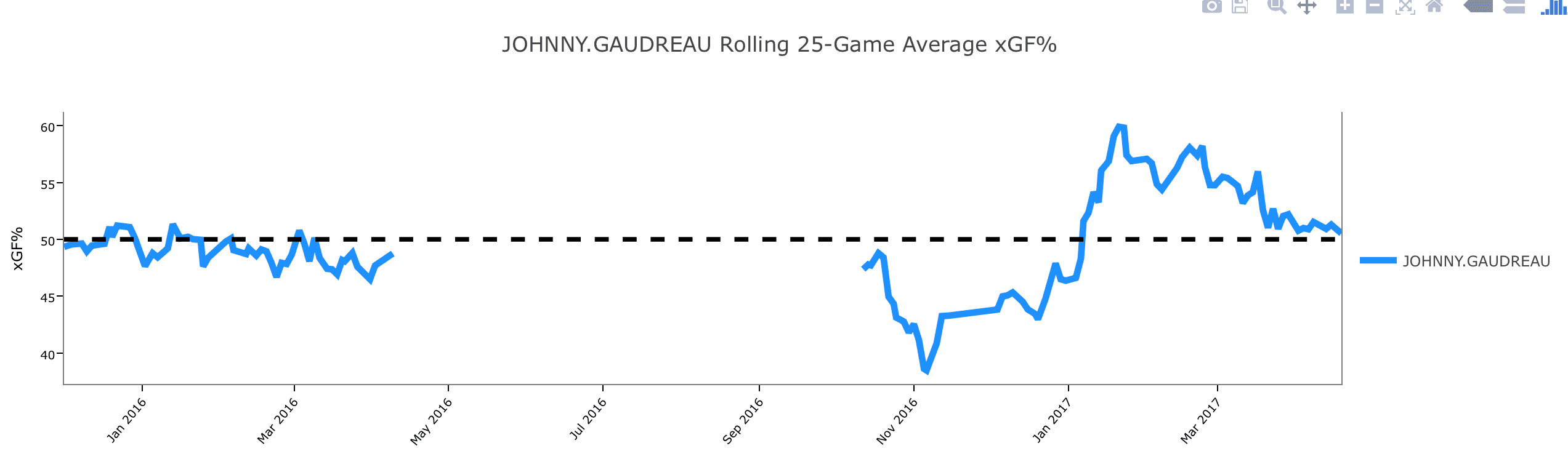 It’s hard to stress how bad linemates Gaudreau and Sean Monahan were to start the year. For the first six weeks of the year, both kids seemed to struggle to adapt to the weight of their new deals, as well as the tactics of the new coaching staff. By the middle of November, both guys boasted some of the worst scoring chance and expected goal ratios on the Flames. Glen Gulutzan even broke up the previously reliable duo for long stretches in the first third of the season. It didn’t help much.
