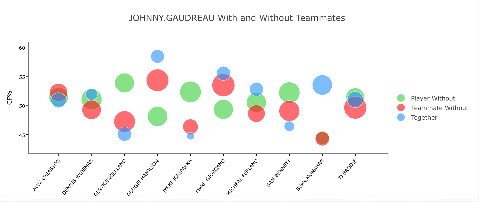 As you can see, playing with Gaudreau was a bit of mixed bag. Most good players were better with him, including Dougie Hamilton, Mark Giordano, and Monahan. Gaudreau also tended to sink with the bottom of the rotation as well, struggling alongside guys like Jyrki Jokipakka, Deryk Engelland, and, (strangely) Sam Bennett.
